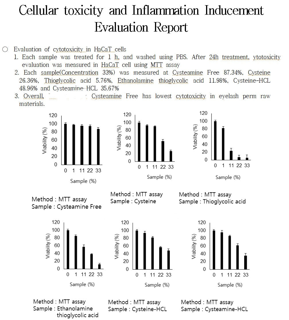 Vårt nya lash- och browlift-system är baserat på cysteamine-free, vilket vetenskapligt har bevisats ha lägst cytotoxicitet, det vill säga de mildaste råa permanentkemikalierna. Detta framgår av det farmaceutiska rapportunderlaget som visas i bilderna.